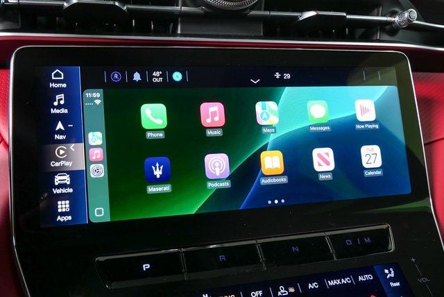 - Radio: Sonus Faber 860 Watts Premium Audio System -inc: 14 speakers w/subwoofer, Maserati Intelligent Assistant (MIA), 12.3" upper touchscreen, 8.8" lower touchscreen, navigation, HD Radio, SiriusXM radio w/1-year trial subscription, wired and wireless Apple CarPlay and Android Auto, Maserati connected services w/trial subscriptions, Alexa in-vehicle voice assistant and eCall and bCall w/trial subscriptions