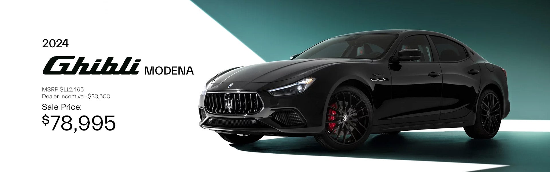 Example: New 2024 Maserati Ghibli Modena. Stock # S4304. MSRP is $112,495. After Dealer Incentive, the sale price is $78,995. TAVT and state fees excluded. All prices include all applicable factory rebates, factory incentives, dealer discounts, and a $799 documentation fee. Some rebates and incentives may require financing through an approved lender. Not all customers will qualify for all rebates or incentives. Prices are subject to change without notice based on manufacturer incentive programs. See dealer for complete details on pricing, discounts, and eligibility. Offer ends and must take delivery by 03/31/2026. See dealer for complete details.
